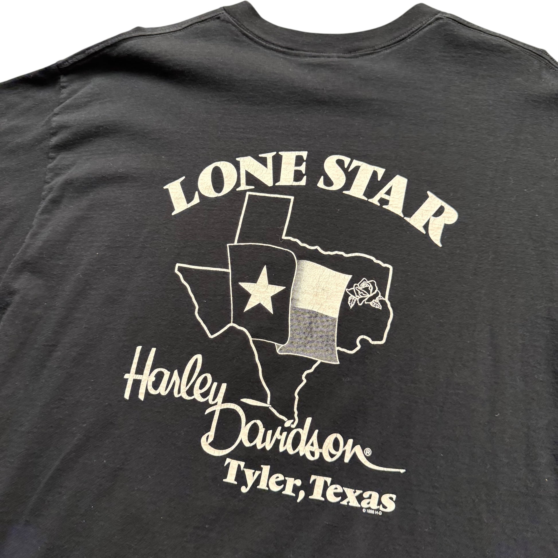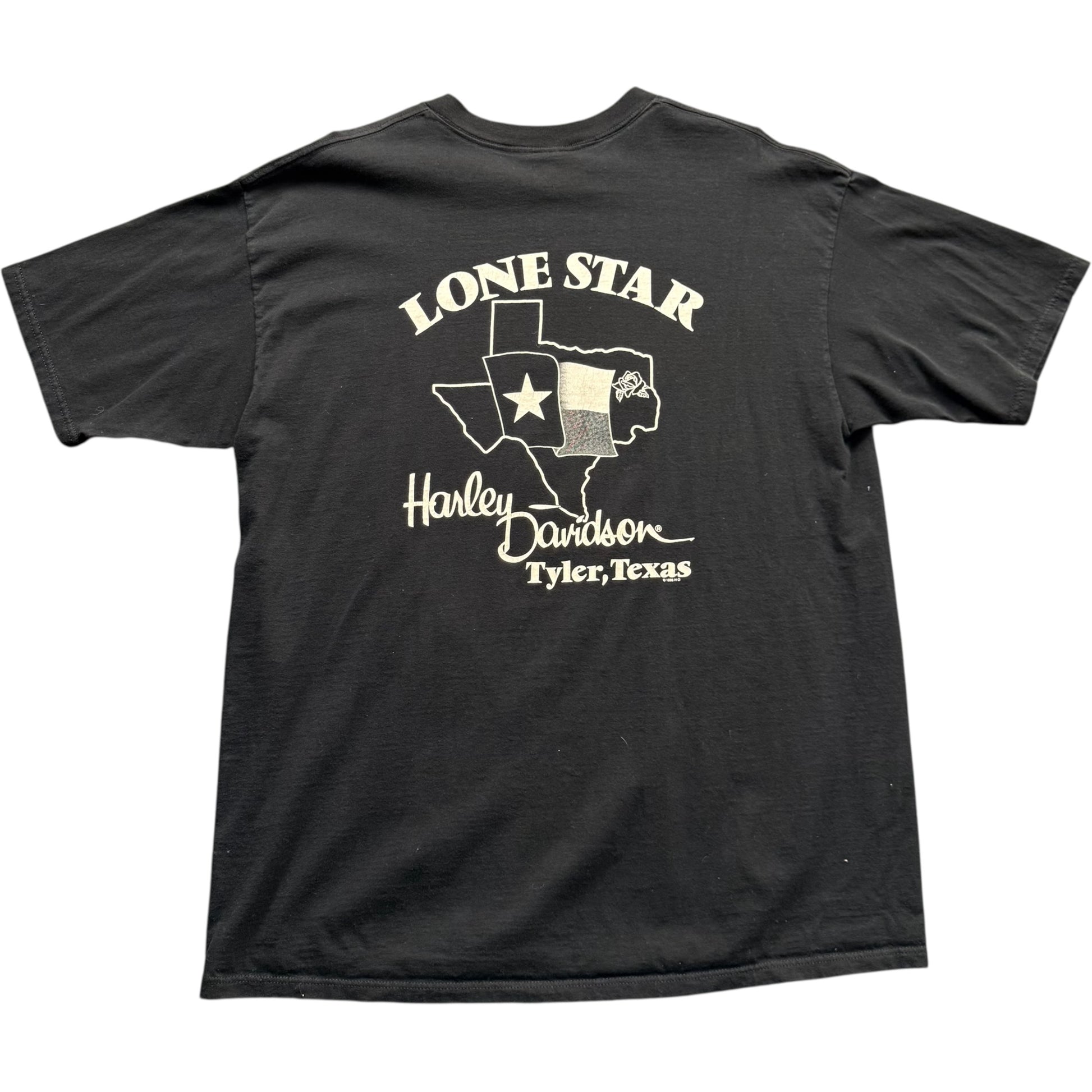 This 1998 Vintage Harley T-Shirt from Texas adds a unique touch to your wardrobe with its classic design. The slight bleach stains give it a one-of-a-kind character, making it perfect for those who appreciate vintage style. Wear it casually or dress it up; it’s versatile and comfortable!